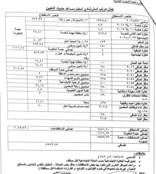 وسوف يكون راتب المعلم المعين حديثا 5489 جنيها، بعد خصم الاستقطاعات المخالفة، بعد أن كان الراتب قبل الاستقطاعات 7552 جنيهًا، فيما سيكون أساسي الراتب على ١ /٣ / ٢٠٢٤ بقيمة ١٣٥٤ جنيها.