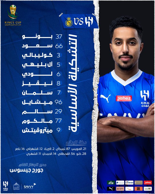 ومع بداية الشوط الثاني، قام جورجي جيسوس بإشراك ياسر الشهراني بدلا من الظهير الأيسر لودي الذي خرج مصابًا بين الشوطين، ليصبح تشكيل الهلال كالتالي: