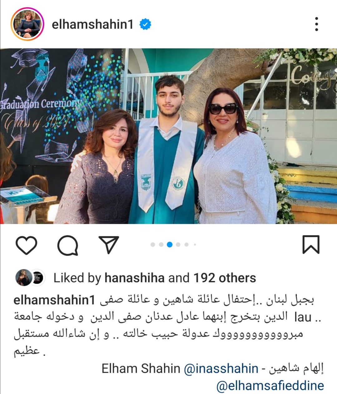 احتفلت الفنانة إلهام شاهين بتخرج نجل شقيقتها والتحاقه بالجامعة في جبل لبنان رفقة أسرتها ومن بينهم ابنة شقيقتها الفنانة الشابة إلهام صفي الدين وعلقت إلهام شاهين على تخرجه بكلمات مؤثرة تبرز فخرها به وبنجاحه.