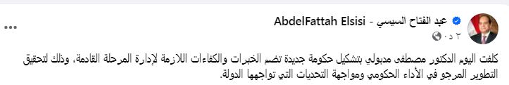 وأضاف الرئيس السيسي عبر صفحته الشخصية: “وذلك لتحقيق التطوير المرجو في الأداء الحكومي ومواجهة التحديات التي تواجهها الدولة”.