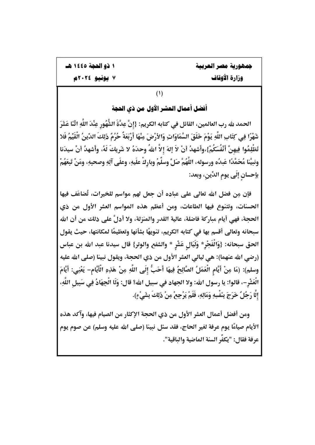 وحددت وزارة الأوقاف، موضوع خطبة الجمعة اليوم في أول أيام ذو الحجة لعام 1445 هجرية، حيث يتحدث أئمة الأوقاف في جميع المساجد على مستوى الجمهورية عن أفضل أعمال العشر الأول من ذي الحجة.