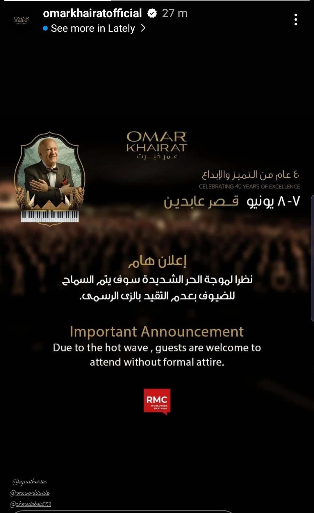 وكتبت الشركة المنظمة لحفل عمر خيرت في قصر عابدين في منشور عبر صفحتهم الرسمية بموقع تبادل الصور والفيديوهات انستجرام، في منشور رصده موقع تحيا مصر : نظرًا لموجة الحر الشديدة سوف يتم السماح للضيوف بعدم التقيد بالزي الرسمي، وذلك بعدما كان من أول شروط حضور الحفل هو الالتزام بالملابس الرسمية”.