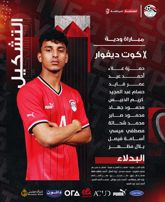 بدأ البرازيلي روجيريو ميكالي المدير الفني لمنتخب مصر الأولمبي المباراة الودية أمام منتخب كوت ديفوار، بتشكيل مكون من: