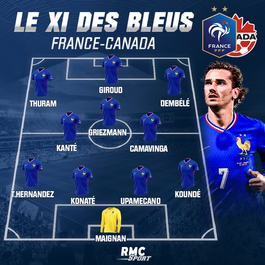 وكان ديديه ديشامب المدير الفني لمنتخب فرنسا قد أعلن عن تشكيله لمواجهة الليلة أمام منتخب كندا، في المباراة الودية التي ستجمع بينهما في إطار الاستعدادات لخوض نهائيات بطولة الأمم الأوروبية 2024 في ألمانيا، وجاء التشكيل كالتالي: