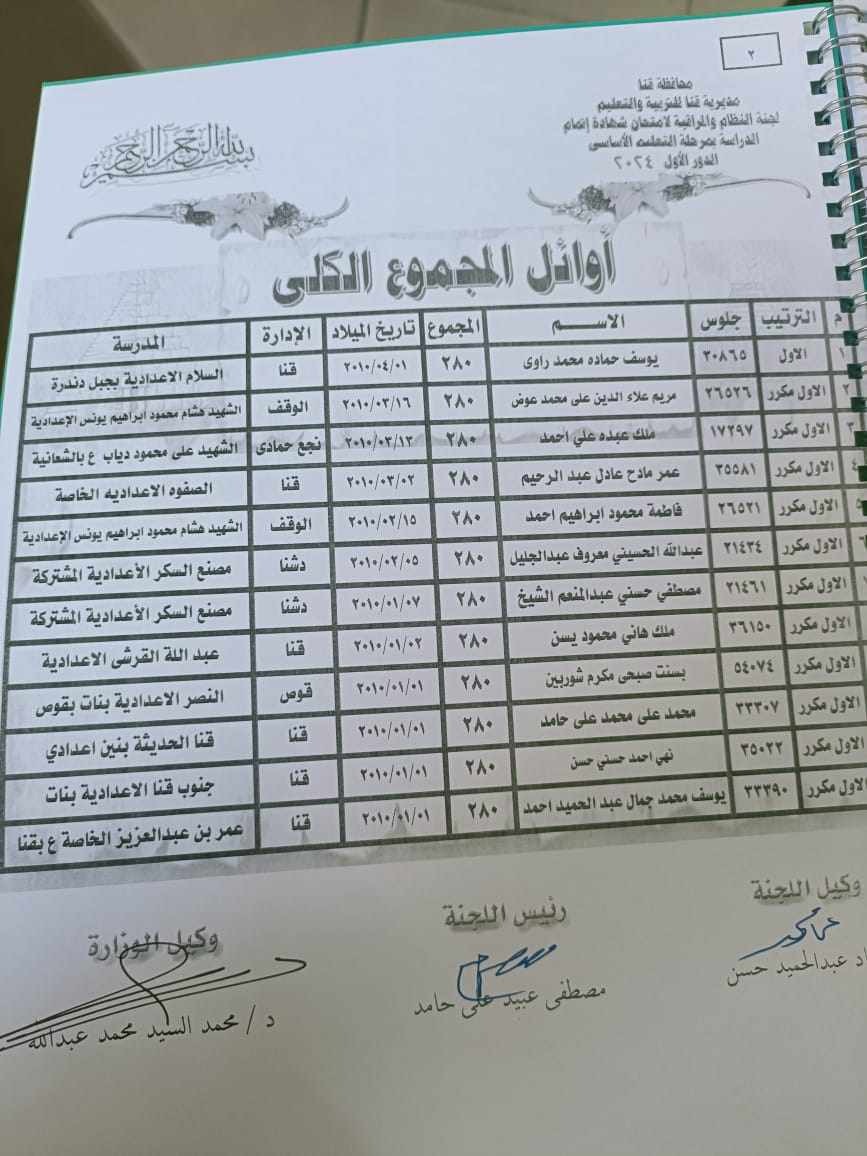 أسماء المتفوقين في الشهادة الإعدادية بمحافظة قنا