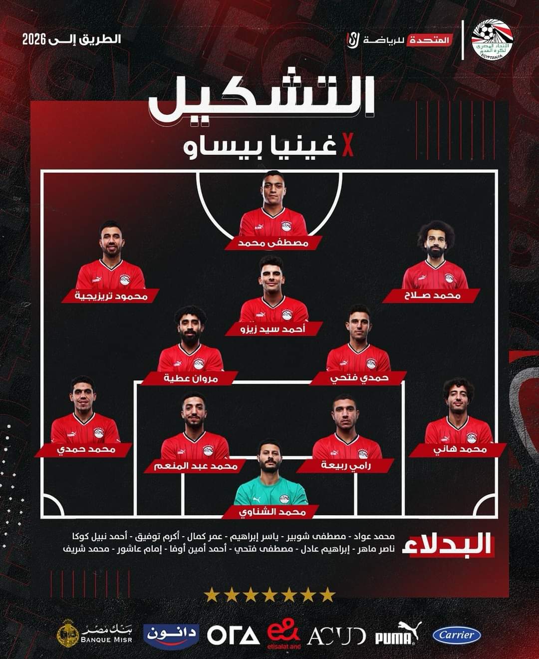 وكان حسام حسن المدير الفني للمنتخب الوطني قد أعلن عن تشكيل منتخب مصر لمواجهة منتخب غينيا بيساو في الجولة الرابعة من تصفيات كأس العالم 2026، كما يلي: