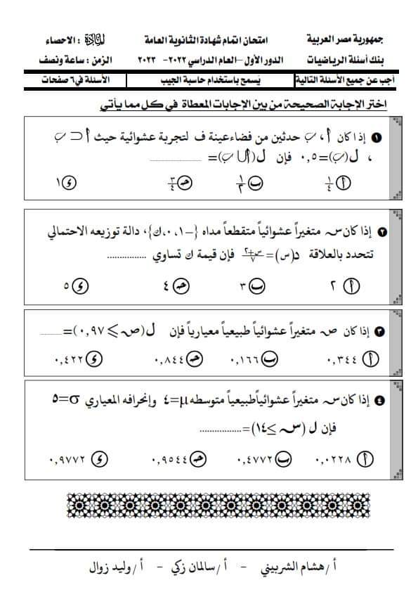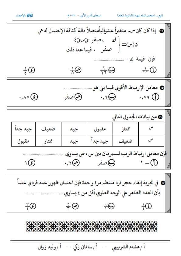 نموذج امتحان الإحصاء للصف الثالث الثانوي 2024 نموذج امتحان الإحصاء للصف الثالث الثانوي 2024 كالآتى: