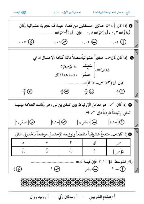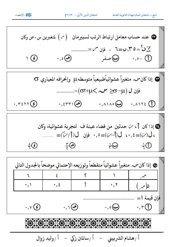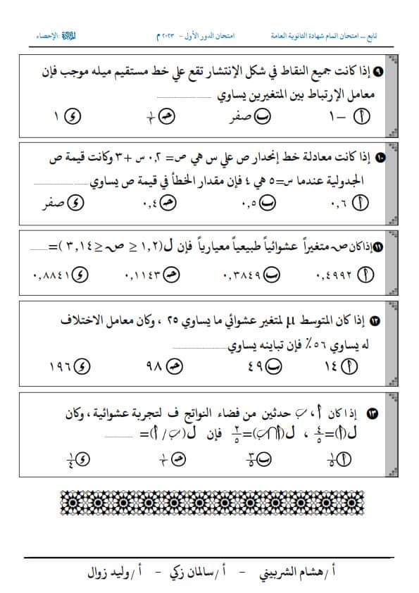 نموذج امتحان الإحصاء للصف الثالث الثانوي 2024