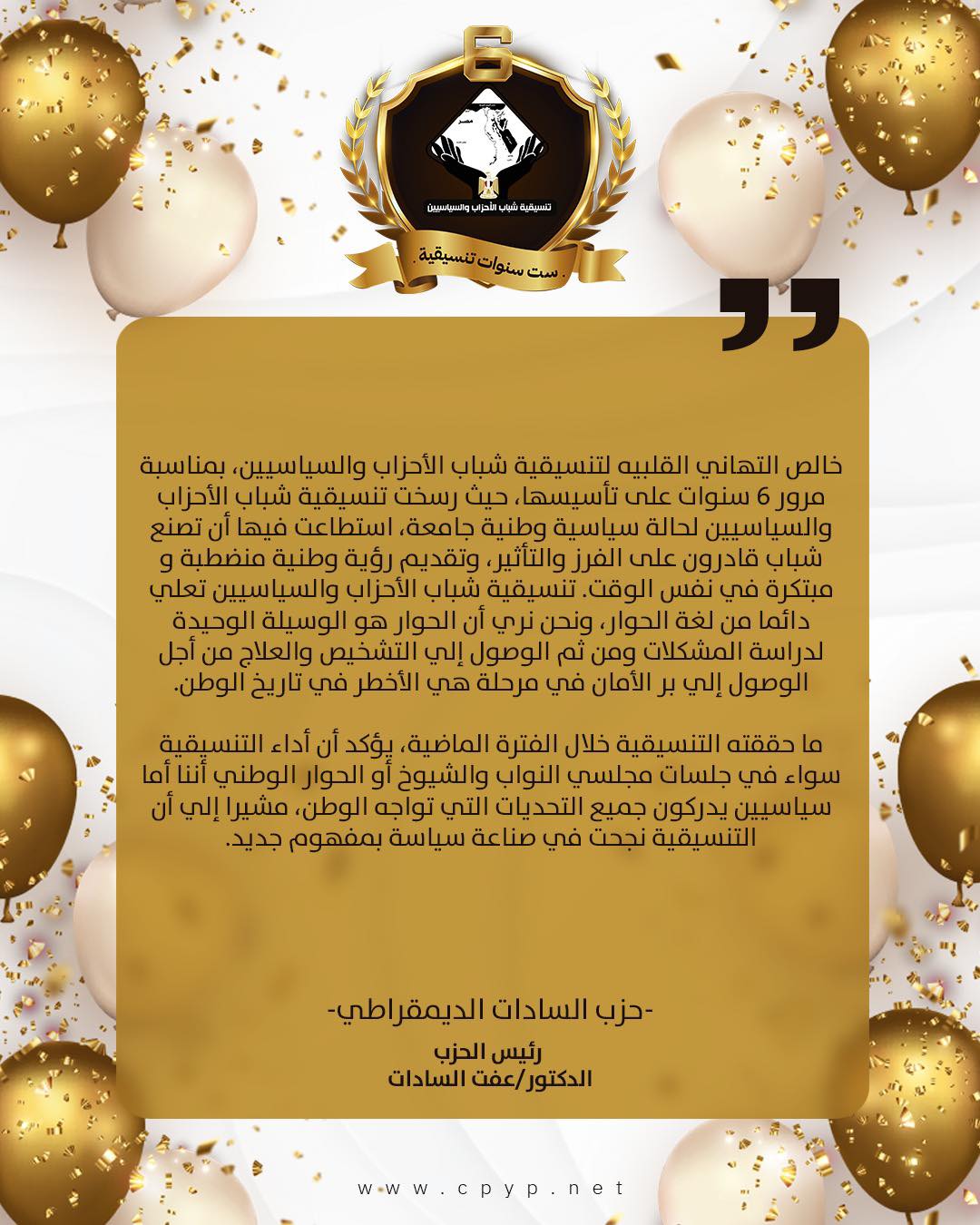 حلت بالأمس الذكرى السادسة على تأسيس تنسيقية شباب الأحزاب والسياسيين، تلك المنصة التي استطاعت أن تجمع 26 حزبًا سياسيًا، ومئات الشباب السياسي من مختلف الأيديولوجيات والأفكار، في تجربة غير مسبوقة، برهنت على أن الاختلاف قوة، وأن الوطن يتسع للجميع.