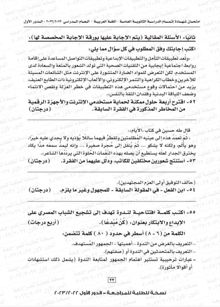 وجاء نموذج امتحان اللغة العربية للثانوية العامة 2024 بالإجابات كالآتى: