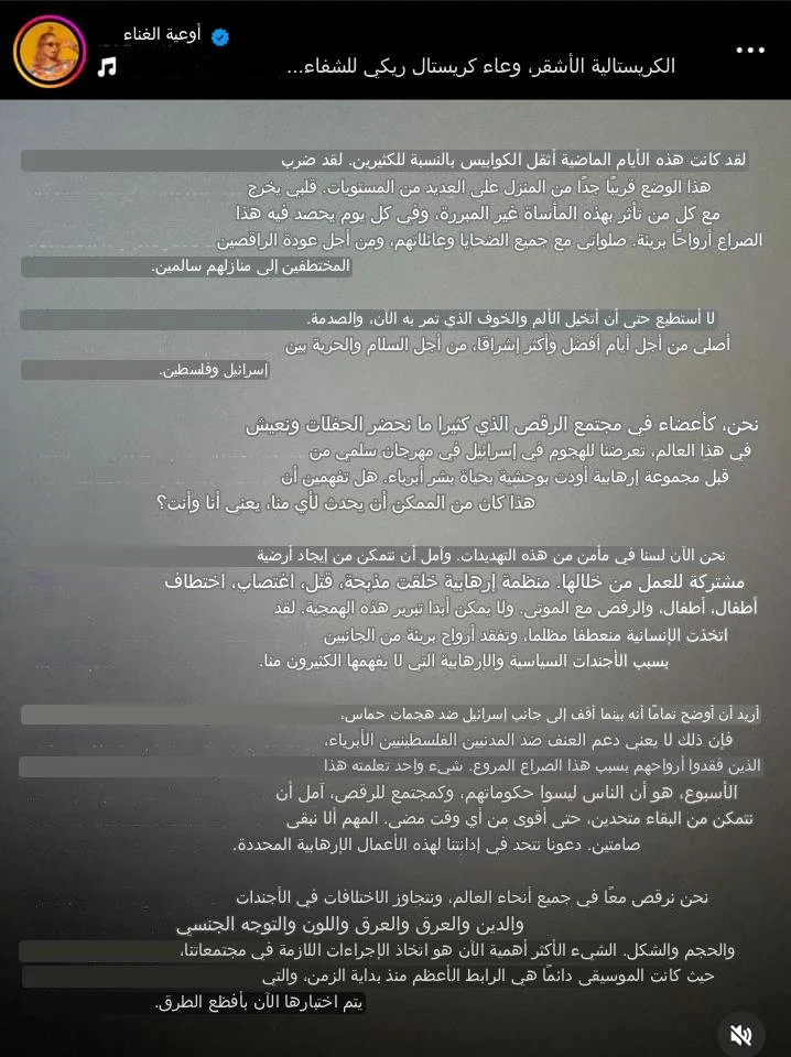 وتابعت قائلة: "نحن كأعضاء في مجتمع الرقص الذي كثيرا ما نحضر الحفلات ونعيش في هذا العالم، تعرضنا للهجوم في إسرائيل في مهرجان سلمي من قبل مجموعة إرهابية أودت بوحشية بحياة بشر أبرياء، هل تفهمين أن هذا كان من الممكن أن يحدث لأي منا، يعني أنا وأنت؟".