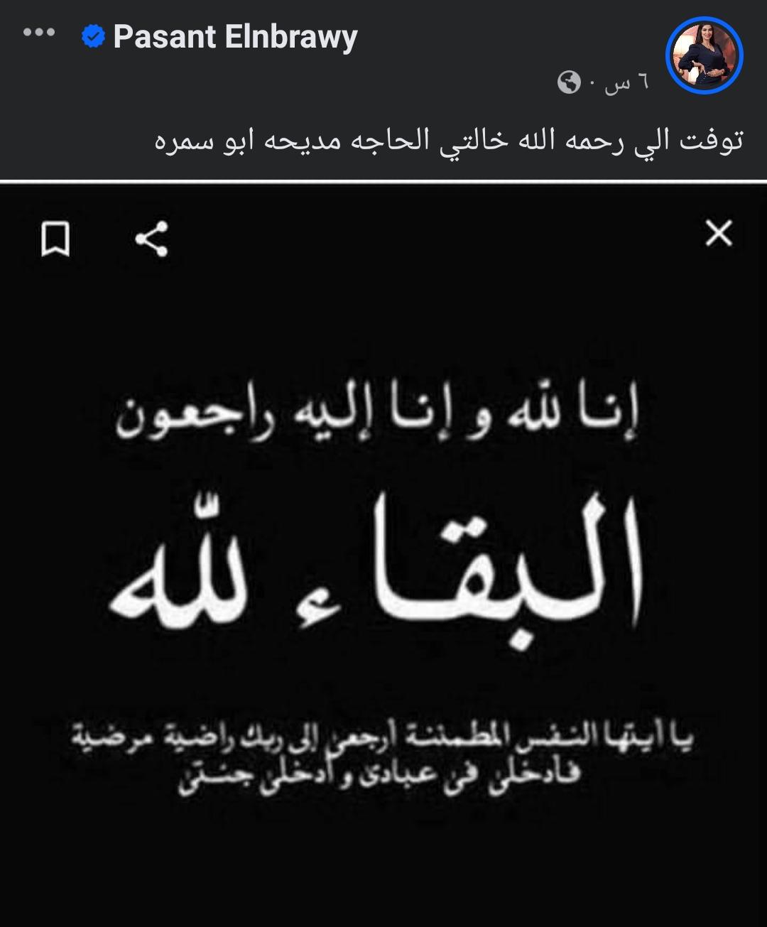 وكتبت بسنت النبراوي في منشورها الذي يرصده موقع تحيا مصر: “توفت إلى رحمة الله خالتي الحاجة مديحة أبو سمرة”، وقد حاز المنشور على إعجاب عدد كبير من الجمهور والمتابعين الذي حرصوا على الدعاء لـ خالة بسنت النبراوي بالرحمة والمغفرة.
