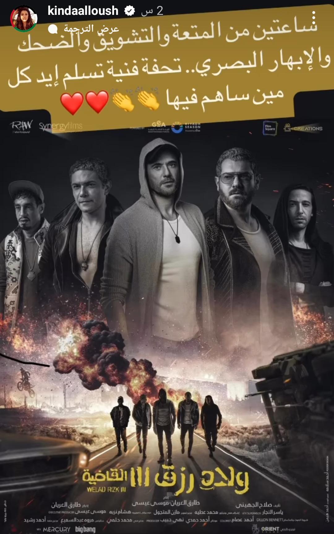 أشادت الفنانة كندة علوش بفيلم ولاد رزق 3 الذي يعرض حاليا في دور العرض السينمائية، وذلك من خلال منشور عبر حسابها الشخصي على موقع تبادل الصور والفيديوهات إنستجرام.
