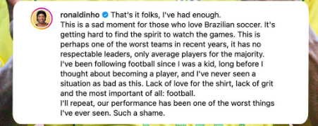 واختتم رونالدينهو رسالته، سأكرر، أدائنا كان من أسوأ الأشياء التي رأيتها على الإطلاق، ياله من عار، ولذلك أعلن اعتزالي. لن أشاهد أي مباراة من مباريات كوبا أمريكا، ولن أحتفل بأي انتصار.