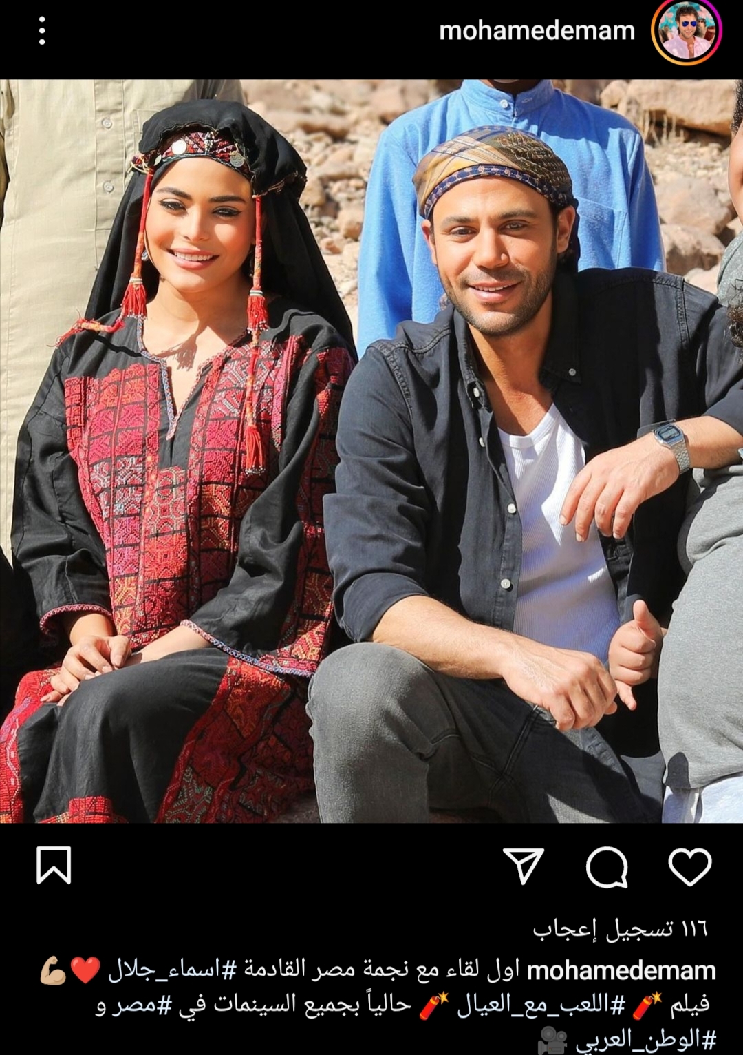 شارك الفنان محمد إمام صورة تجمعه بالنجمة أسماء جلال وذلك عبر حسابه الرسمي على موقع التبادل الصور والفيديوهات انستجرام وعلق الفنان محمد امام على الصورة مُشيدًا بأداء أسماء جلال خاصةً وأن هذه المرة الأولى التي يتعاون فيها الثنائي، وكتب محمد إمام وفقًا لما رصده موقع تحيا مصر: "أول لقاء مع نجمة مصر القادمة .. أسماء جلال فيلم اللعب مع العيال"، وجاءت التعليقات على منشور نحمد إمام تؤيده في ذلك ومشيدين بأداء النجمة أسماء جلال حيث أنها تعيش انتعاشة فنية الفترة الحالية.
