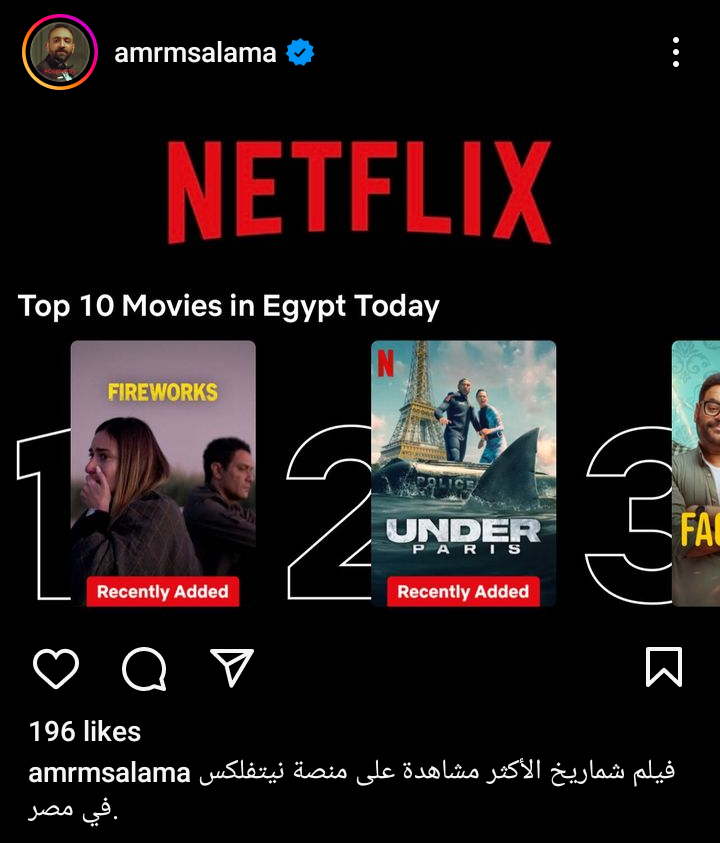 وشارك عمرو سلامة صورة لتصدر فيلم شماريخ الأكثر مشاهدة على منصة نتفلكس وذلك عبر حسابه الرسمي بموقع تبادل الصور والفيديوهات انستجرام في منشور رصده موقع تحيا مصر، وعلق عليه قائلا: فيلم شماريخ الأكثر مشاهدة على نتفلكس في مصر.