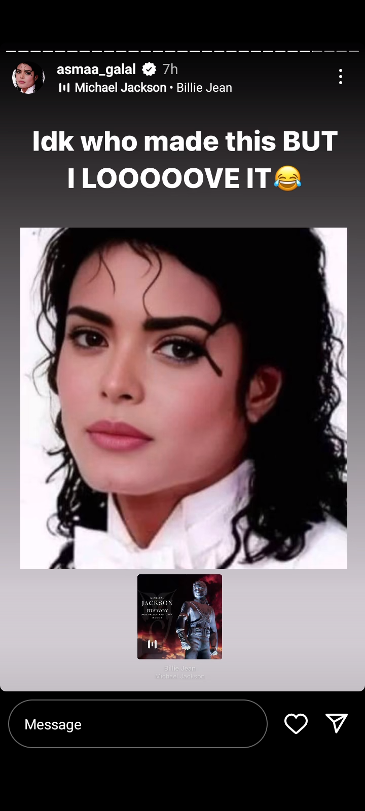 ونشرت أسماء جلال صورة لاسماء جلال في زي مايكل جاكسون، وذلك عبر حسابها الرسمي بموقع تبادل الصور والفيديوهات انستجرام من خلال خاصة ستوري، ورصده موقع تحيا مصر وعلقت عليه، قائلة: لا اعرف من صنع هذا ولكن احببته.
