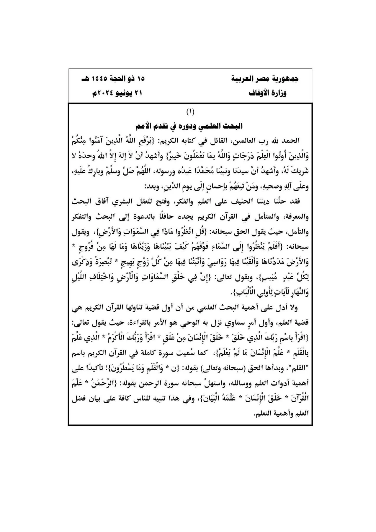 حددت وزارة الأوقاف، موضوع خطبة الجمعة اليوم، تحت عنوان "البحث العلمي ودوره في تقدم الأمم".