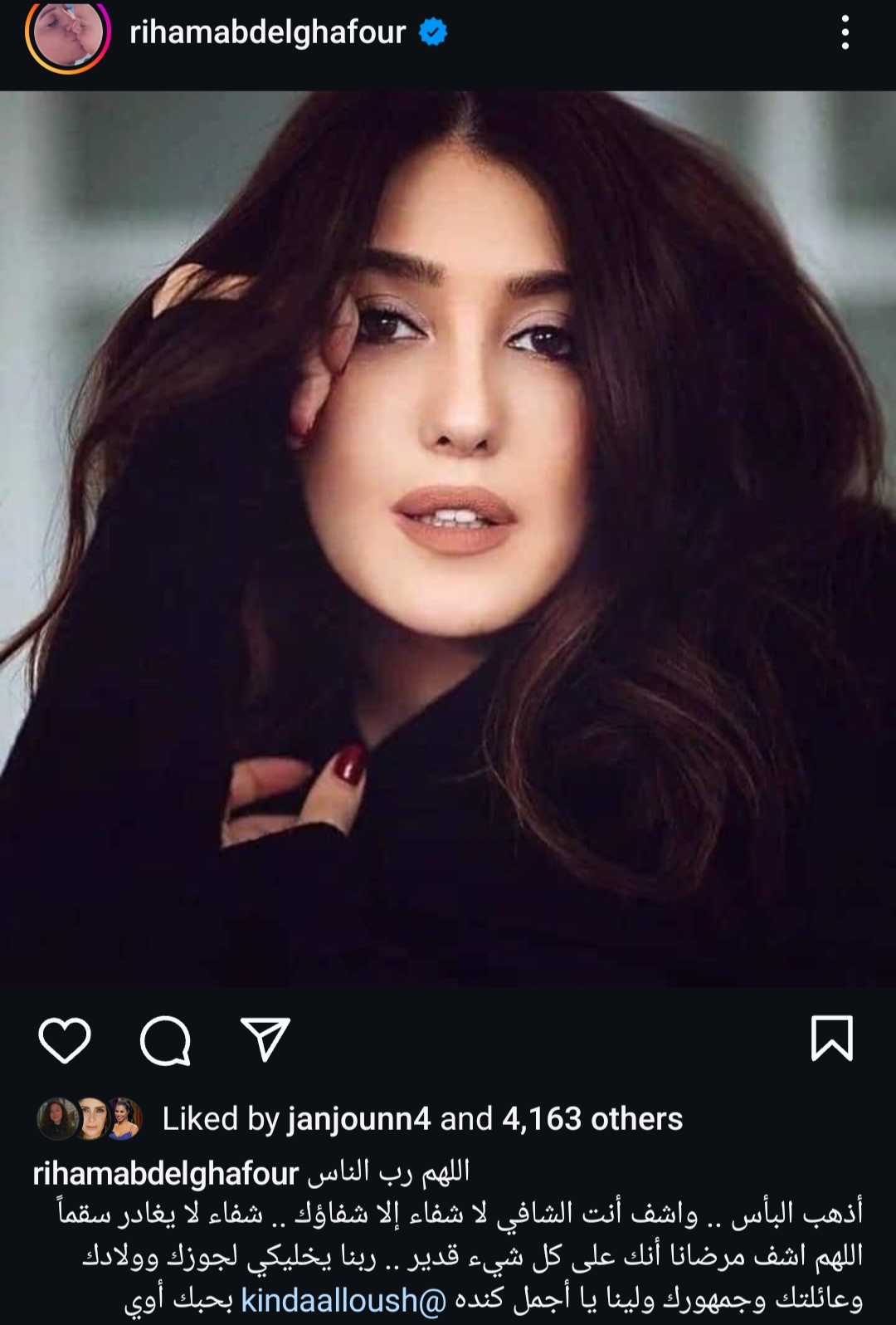 شاركت الفنانة ريهام عبد الغفور صورة كندة علوش عبر حسابها الرسمي على موقع تبادل الصور والفيديوهات انستجرام، وعلقت عليها بكلمات تحاول فيها دعمها كما أنها قامت بالدعاء لها والطلب من جمهورها ومتابعيها أن يدعون لها، وكتبت ريهام عبد الغفور على الصورة: “اللهم رب الناس اذهب البأس.. انت الشافي لا شفاء إلا شفاؤك ..شفاء لا يغادر سقمًا اللهم اشف مرضانا إنك على كل شئ قدير، ربنا يخليكي لجوزك وولادك وعائلتك وجمهورك ولينا يا أجمل كندة ..بحبك أوي”.