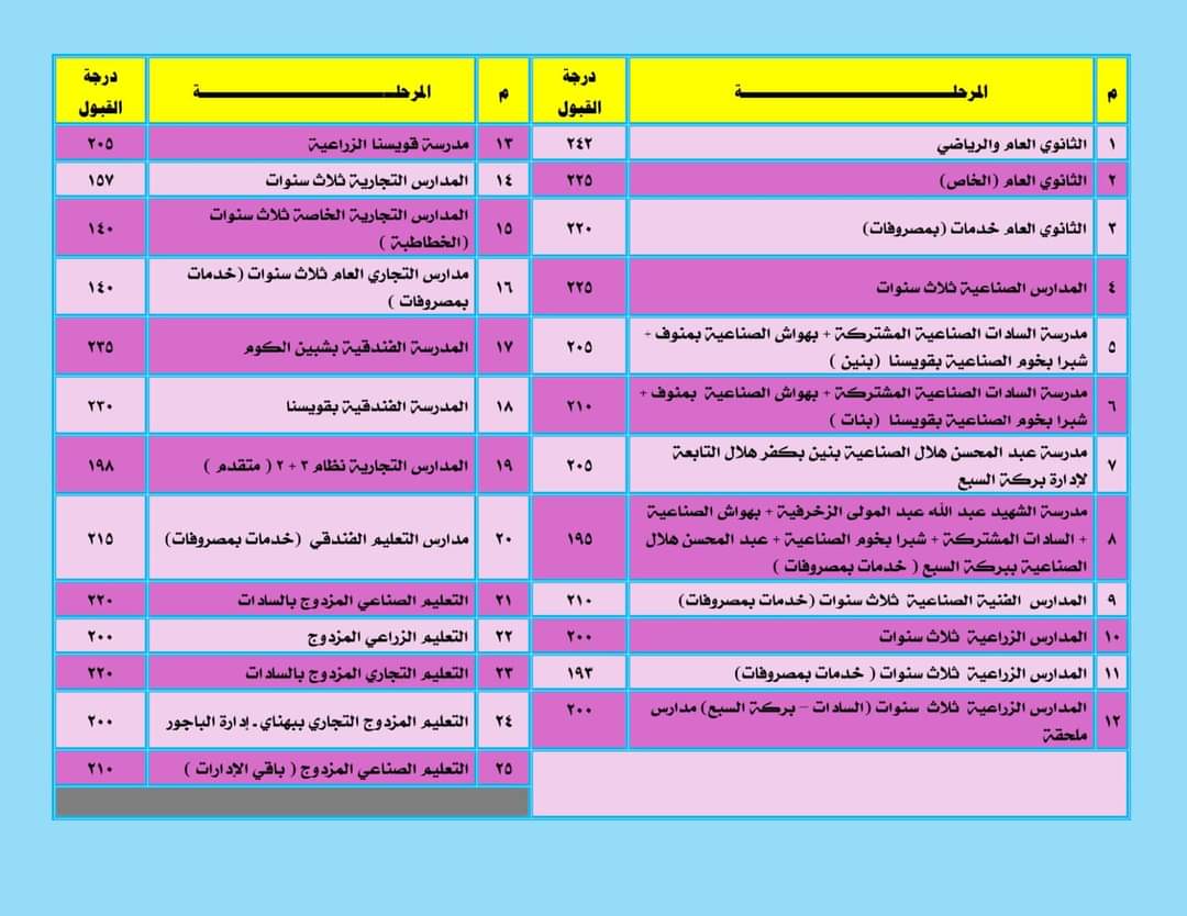 فيما تضمن التنسيق المدرسة الفندقية بشبين الكوم ( 235) درجة، والمدرسة الفندقية بقويسنا ( 230) درجة، والمدارس التجارية نظام 3+ 2 (متقدم ) ( 198) درجة، و( 215 ) درجة بمدارس التعليم الفندقي خدمات بمصروفات، و مدارس التعليم الصناعي المزدوج بالسادات ( 220) درجة، والتعليم الزراعي المزدوج ( 200) درجة، و التعليم التجاري المزدوج بالسادات (220) درجة، والتعليم المزدوج التجاري ببهناي بالباجور ( 200) درجة ، و التعليم الصناعي المزدوج بباقي الإدارات ( 210 ) درجة.