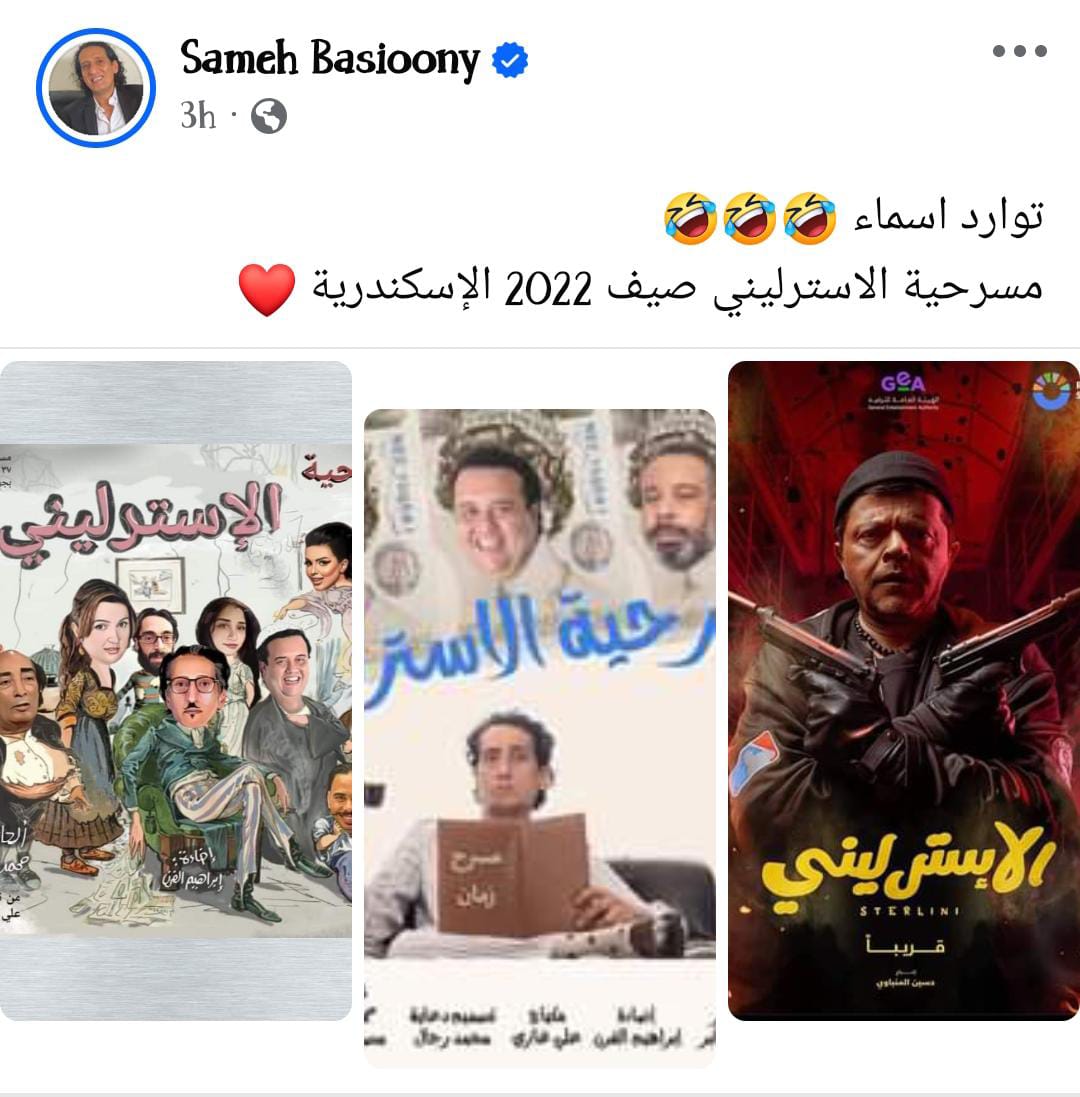 وعلق سامح بسيوني على هذا وقال: "توارد أسماء.. مسرحية الإسترليني صيف 2022 الإسكندرية".