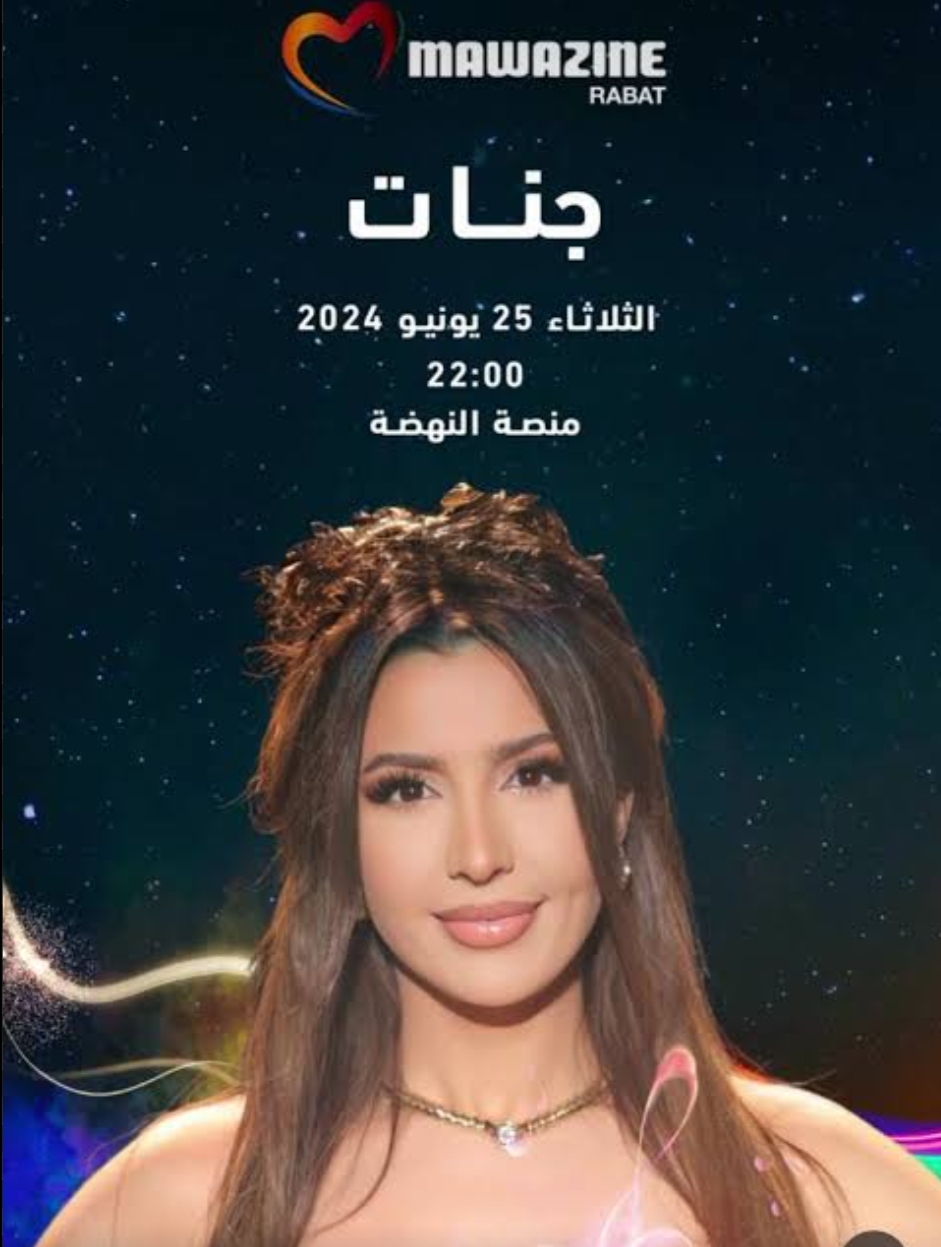 تجهز الفنانة جنات لأحياء حفلها مساء اليوم على منصة النهضة ضمن حفلات مهرجان موازين بالمغرب، وستقدم مجموعة متنوعة ومميزة من اغانيها القديمة والجديدة التي يتفاعل معها الجمهور.