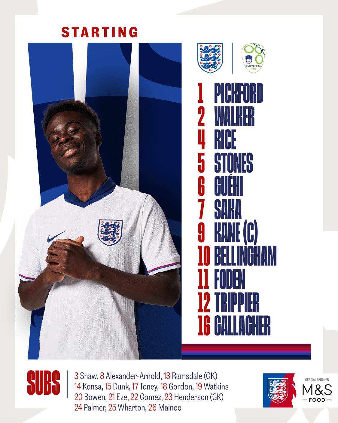 وجاء تشكيل منتخب إنجلترا في مواجهة منتخب سلوفينيا ضمن مباريات الجولة الثالثة لحساب المجموعة الثالثة من دور المجموعات من بطولة الأمم الأوروبية 2024 كالتالي: