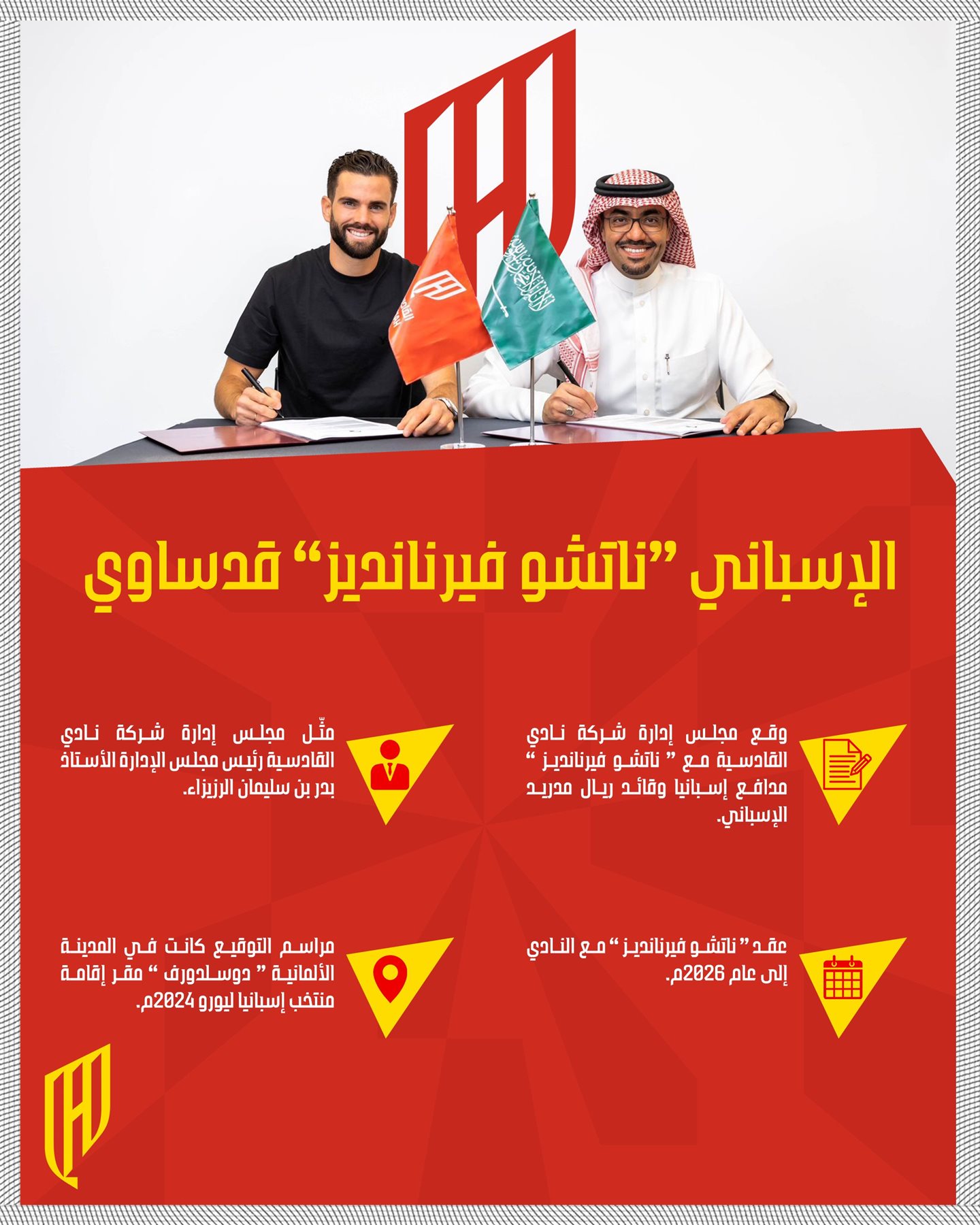 وعلى الرغم من خوض ناتشو رفقة المنتخب الإسباني مباريات كأس الأمم الأوروبية 2024 في ألمانيا، إلا أن هذا لم يمنع مسئولي نادي القادسية السعودي وعلى رأسهم رئيس النادي بدر بن سليمان الرزيزاء، من التوجه إلى ألمانيا، والتوقيع مع اللاعب في مدينة “دوسلدورف” مقر إقامة المنتخب الإسباني، بعقد يمتد لمدة موسمين حتى صيف 2026 القادم.
