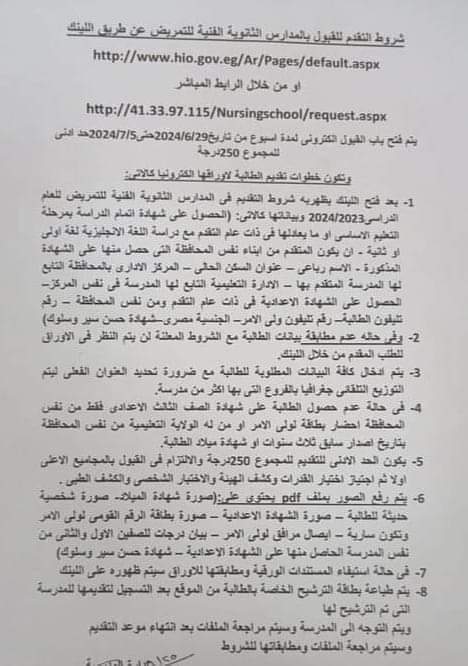 ويأتى موعد التقدم للقبول بالمدارس الثانوية الفنية للتمريض فى الفترة من ٢٠٢٤/٦/٢٩ حتى ٢٠٢٤/٧/٥ بمجموع (٢٥٠).
