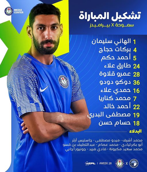 أما اختيارات أحمد سامي المدير الفني لنادي سموحة في مواجهة نادي بيراميدز، ضمن مباريات الجولة رقم 28 من الدوري المصري الممتاز، جاءت كما يلي: