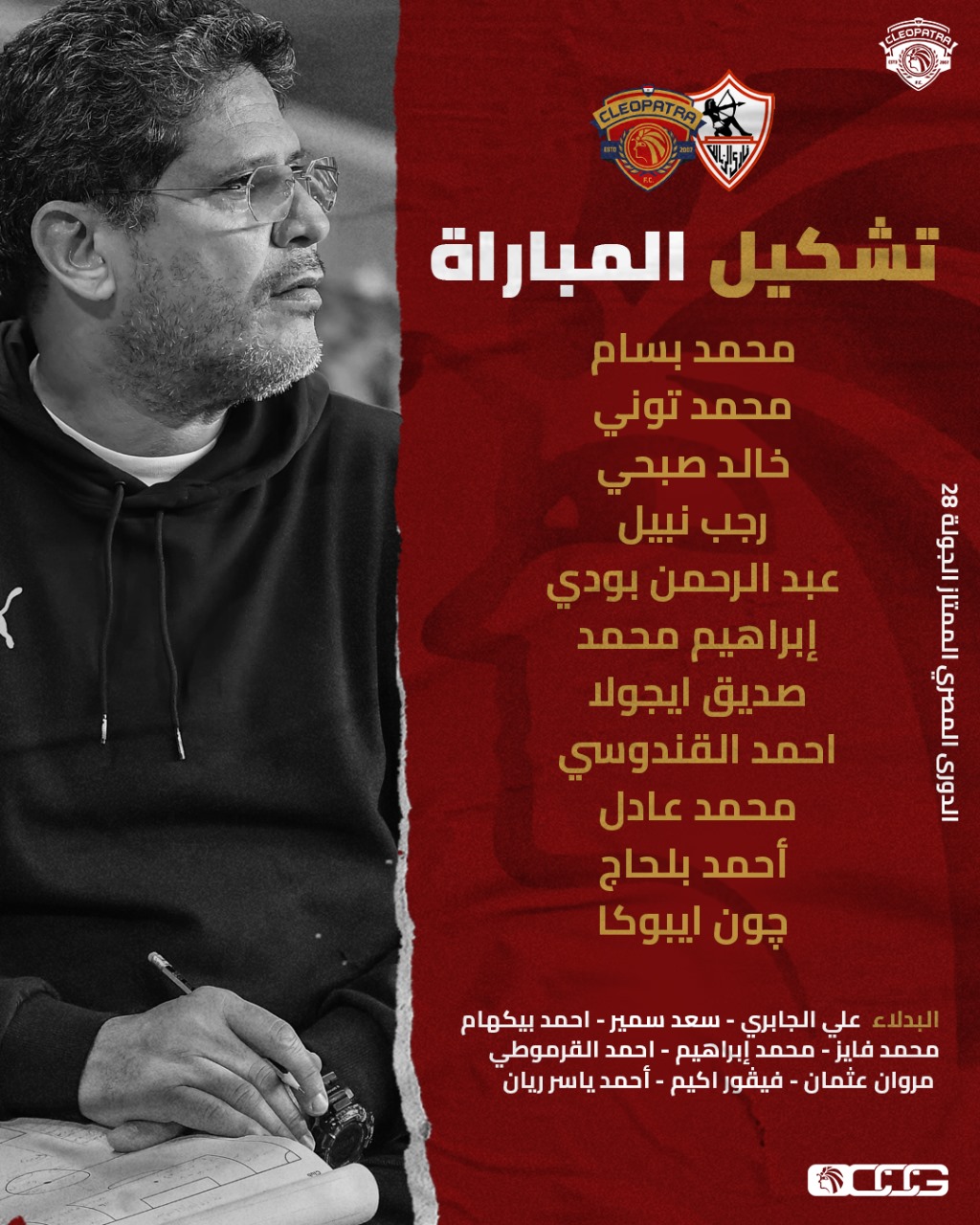 أما اختيارات أيمن الرمادي المدير الفني لنادي سيراميكا كليوباترا لتشكيل فريقه أمام الزمالك، ضمن مباريات الجولة رقم 28 من الدوري المصري الممتاز، جاءت كما يلي: