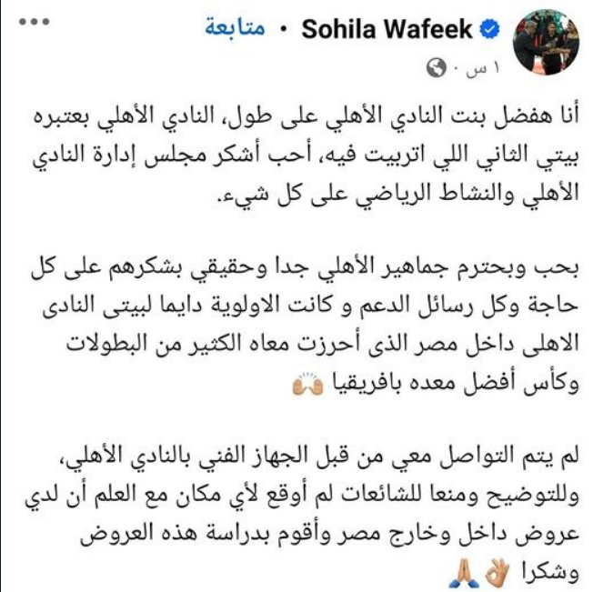 وأختتمت سهيلة وفيق قائلة:" لم يتم التواصل معي من قبل الجهاز الفني بالنادي الأهلي، وللتوضيح ومنعا للشائعات لم أوقع لأي مكان مع العلم أن لدي عروض داخل، وخارج مصر، وأقوم بدراسة هذه العروض وشكراً".