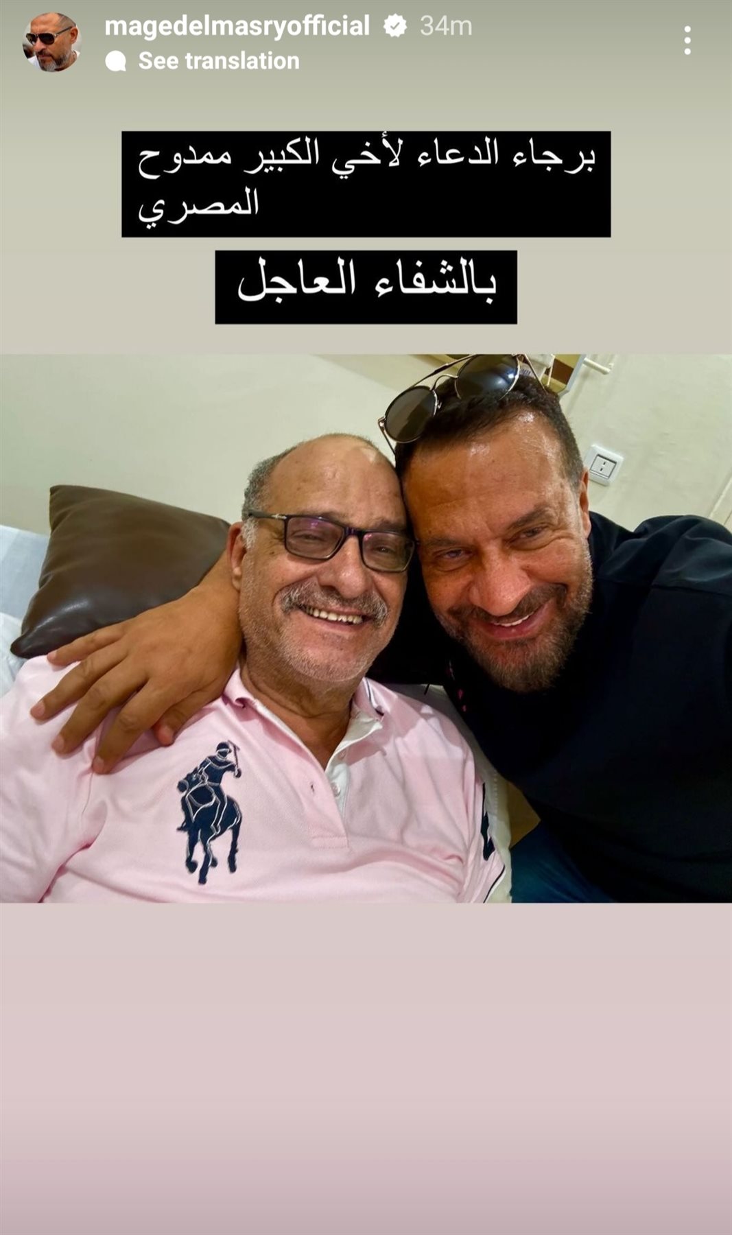 ونشر ماجد المصري في منشوره الذي يرصده موقع تحيا مصر صورة له رفقة شقيقه من خلال خاصية استوري، وعلق عليها قائلًا: "برجاء الدعاء لأخي الكبير ممدوح المصري بالشفاء العاجل".
