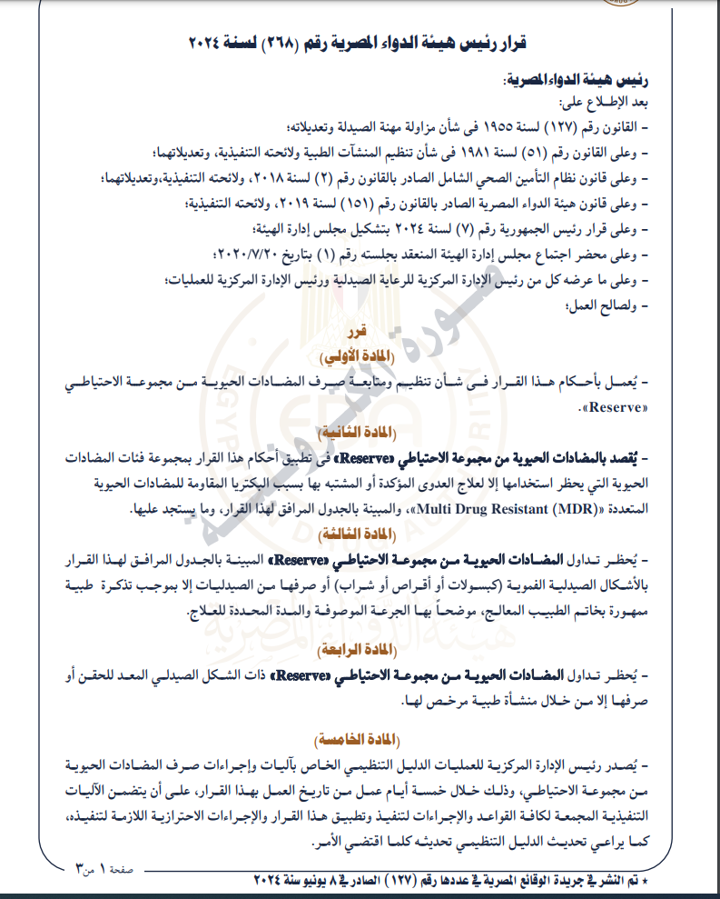- يعمل بأحكام هذا القرار في شأن تنظيم ومتابعة صرف المضادات الحيوية من مجموعة الاحتياطي «Reserve»