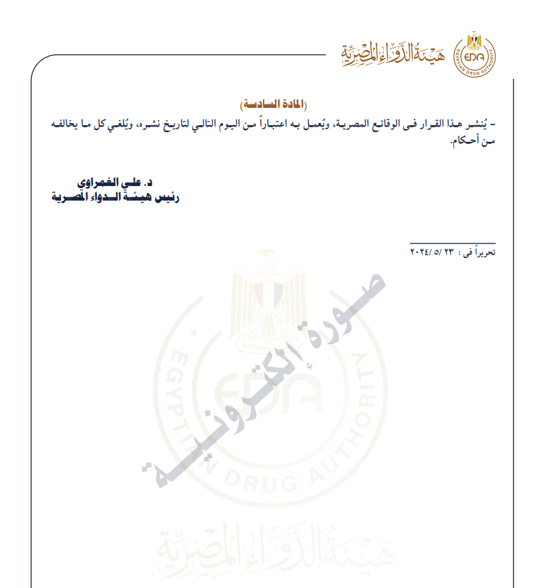 بعد الاطلاع على: القانون رقم (127) لسنة 1955 في شأن مزاولة مهنة الصيدلة وتعديلاته: وعلى القانون رقم (51) لسنة 1981 في شأن تنظيم المنشآت الطبية ولائحته التنفيذية، وتعديلاتهما: - وعلى قانون نظام التأمين الصحي الشامل الصادر بالقانون رقم (2) لسنة 2018 ، ولائحته التنفيذية، وتعديلاتهما؛ وعلى قانون هيئة الدواء المصرية الصادر بالقانون رقم (151) لسنة 2019 ، ولائحته التنفيذية وعلى قرار رئيس الجمهورية رقم (7) لسنة 2024 بتشكيل مجلس إدارة الهيئة وعلى محضر اجتماع مجلس إدارة الهيئة المنعقد بجلسته رقم (1) بتاريخ 2020/7/20 وعلى ما عرضه كل من رئيس الإدارة المركزية للرعاية الصيدلية ورئيس الإدارة المركزية للعمليات.