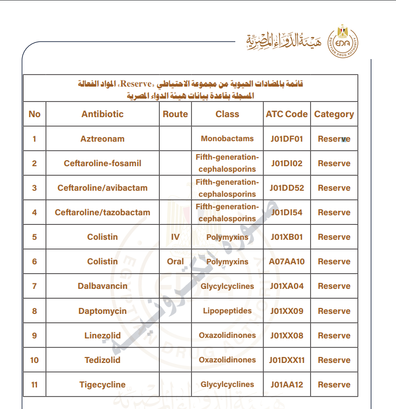 يحظر تداول المضادات الحيوية من مجموعة الاحتياطي Reserves المبينة بالجدول المرافق لهذا القرار بالأشكال الصيدلية الفموية كبسولات أو أقراص أو شراب أو صرفها من الصيدليات إلا بموجب تذكرة طبية ممهورة بخاتم الطبيب المعالج، موضحاً بها الجرعة الموصوفة والمدة المحددة للعلاج.
