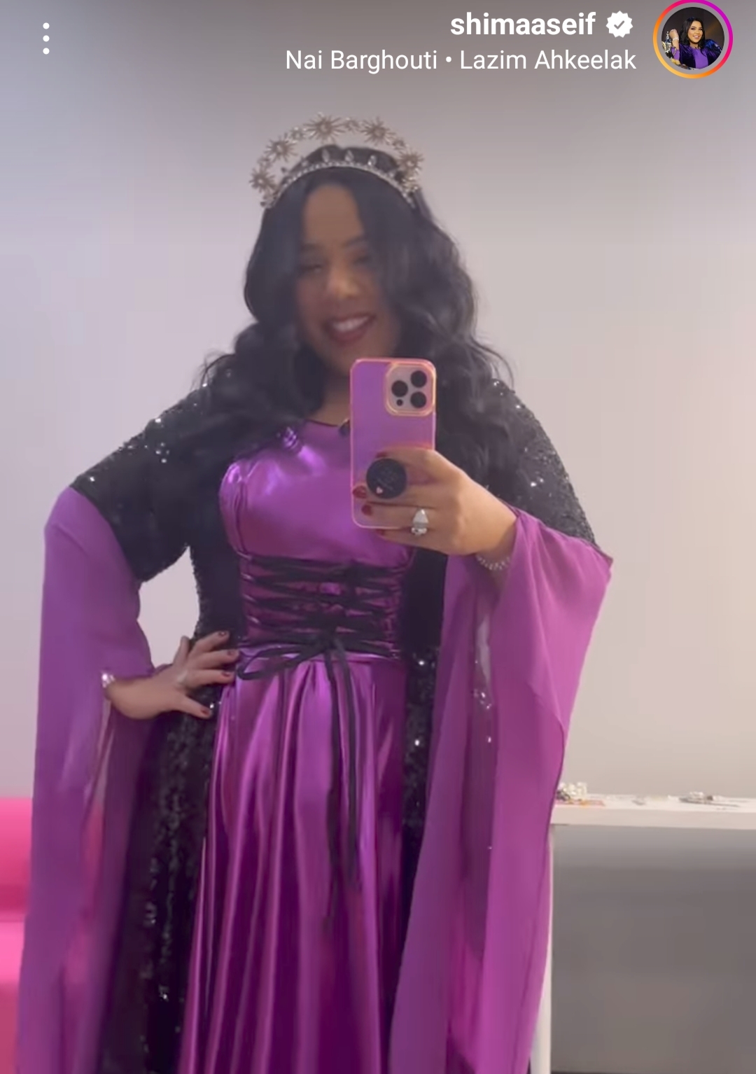وتألقت شيماء سيف بإطلالة مختلفة، مرتدية فستان من اميرات ديزني باللون البنفسجي بأكمام واسعة، ونسقت معه القماش اللامع باللون الأسود.