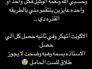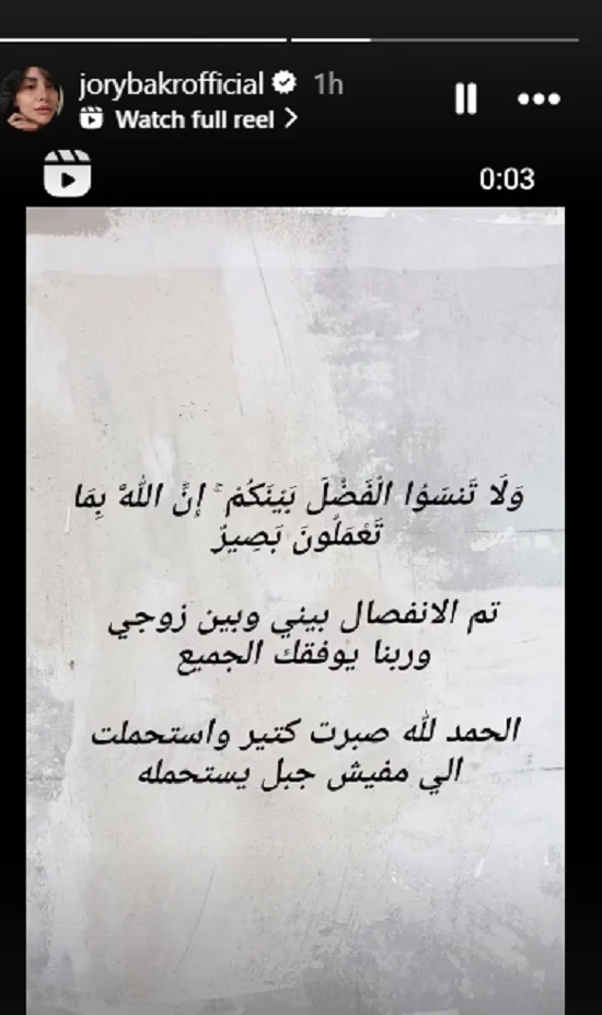 وقالت فيها: "ولا تنسوا الفضل بينكم إن الله بما تعملون بصير، تم الانفصال بيني وبين زوجي وربنا يوفق الجميع، الحمد لله صبرت كثير واستحملت اللي مفيش جبل يستحمله".