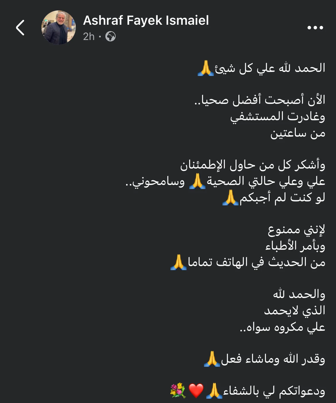 وتابع أشرف فايق قائلًا: "وأشكر كل من حاول الاطمئنان عليا وعلى حالتي الصحية، سامحوني لو كنت لم أجبكم، لأنني ممنوع وبأمر الأطباء من الحديث في الهاتف تمامًا، والحمدلله الذي لا يحمد على مكروه سواه، وقدر الله وما شاء فعل، دعواتكم لي بالشفاء".