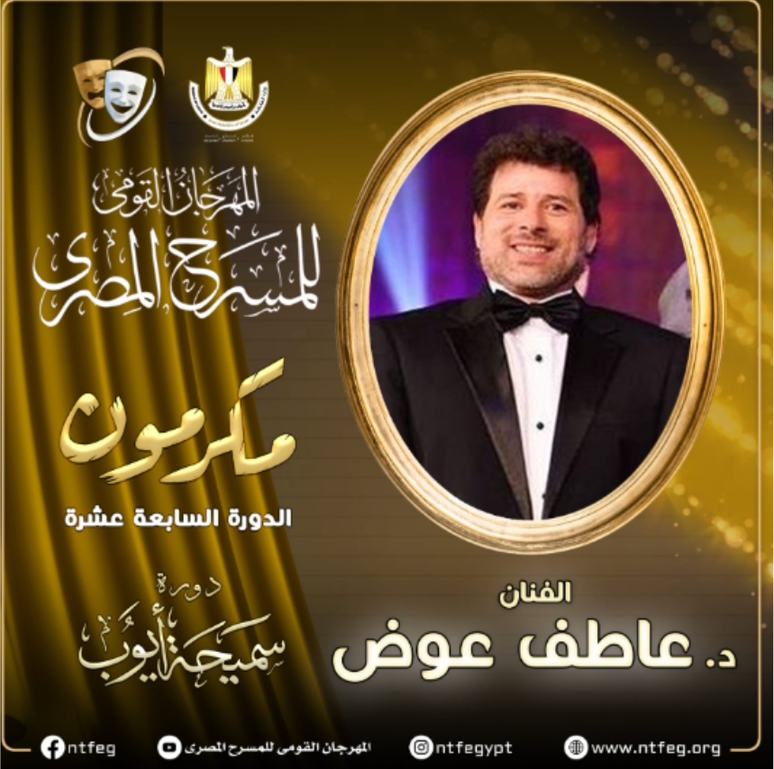يُكرم المهرجان القومي للمسرح المصري، الفنان الدكتور عاطف عوض العميد السابق للمعهد العالي للباليه، برئاسة الفنان محمد رياض خلال دورته السابعة عشرة، وذلك تقديرًا لمسيرته الفنية الكبير والمليئة بالأعمال المسرحية بشكل خاص، والفنية بشكل عام.
