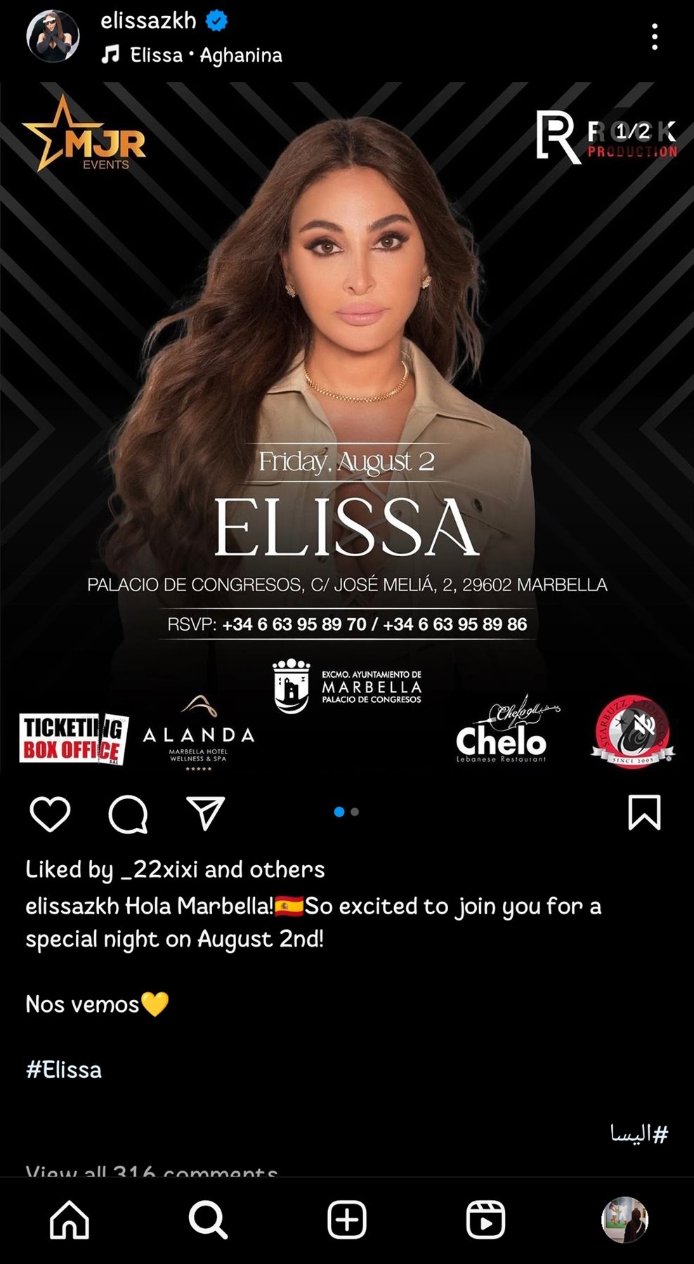 روجت المطربة إليسا لحفلها القادم في اسبانيا في مدينة ماربيلا يوم 2 أغسطس القادم، عبر حسابها الرسمي بموقع تبادل الصور والفديوهات إنستجرام، ورصده موقع تحيا مصر، وكتبت: مرحبا أسبانيا، متحمسة جدًا للانضمام إليكم في ليلة خاصة في الثاني من أغسطس.