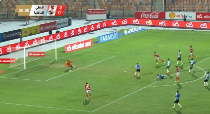 وسدد إمام عاشور الكرة بقوة كبيرة من خارج منطقة الجزاء صاروخ أرض جو وسدد الكرة وأعلن عن الهدف الثالث للنادي الأهلي وضمان نتيجة المباراة والنقاط.