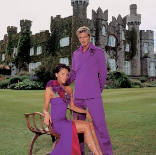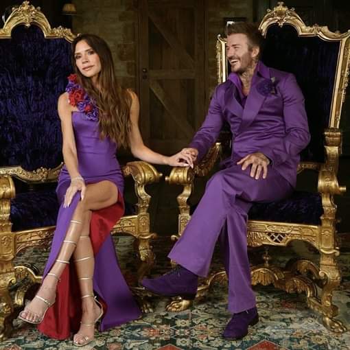 وأطلت عارضة الأزياء فيكتوريا بيكهام، بإطلالة مميزة، مرتدية فستان باللون البنفسجي، مفتوح من الساقين، مرصع بالورود على منطقة الكتف، بينما ارتدى زوجها ديفيد بيكهام نفس الإطلالة أيضا وهو قميص وبنطلون كلاسيك باللون البنفسجي.