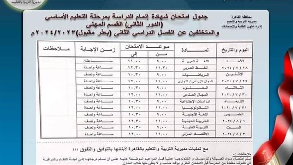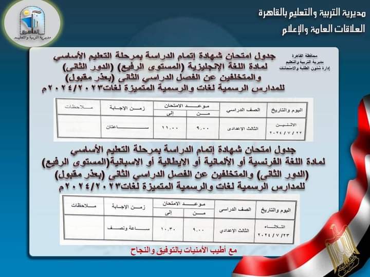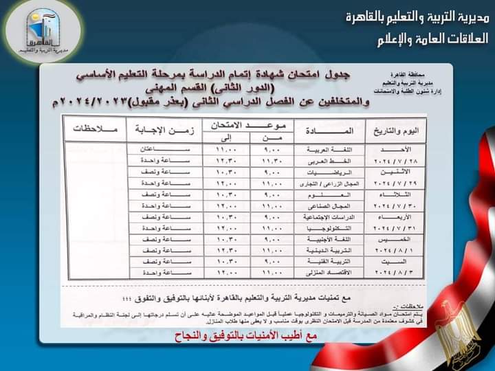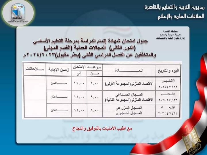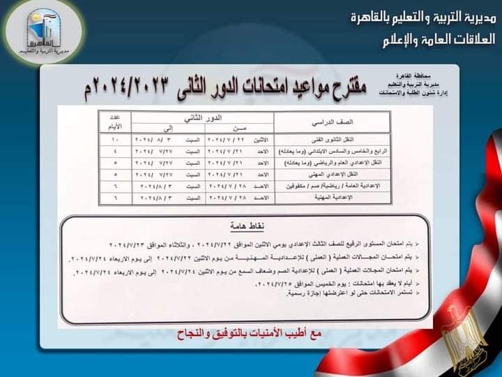 - جداول امتحانات الدور الثاني محافظة القاهرة 2024