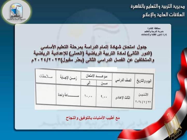 الشهادة الإعدادية العامة والرياضية والصم وضعاف السمع والمكفوفين والمهنية والرياضية خلال الفترة من الأحد ٢٠٢٤/٧/٢٨ حتى السبت الموافق ٢٠٢٤/٨/٣