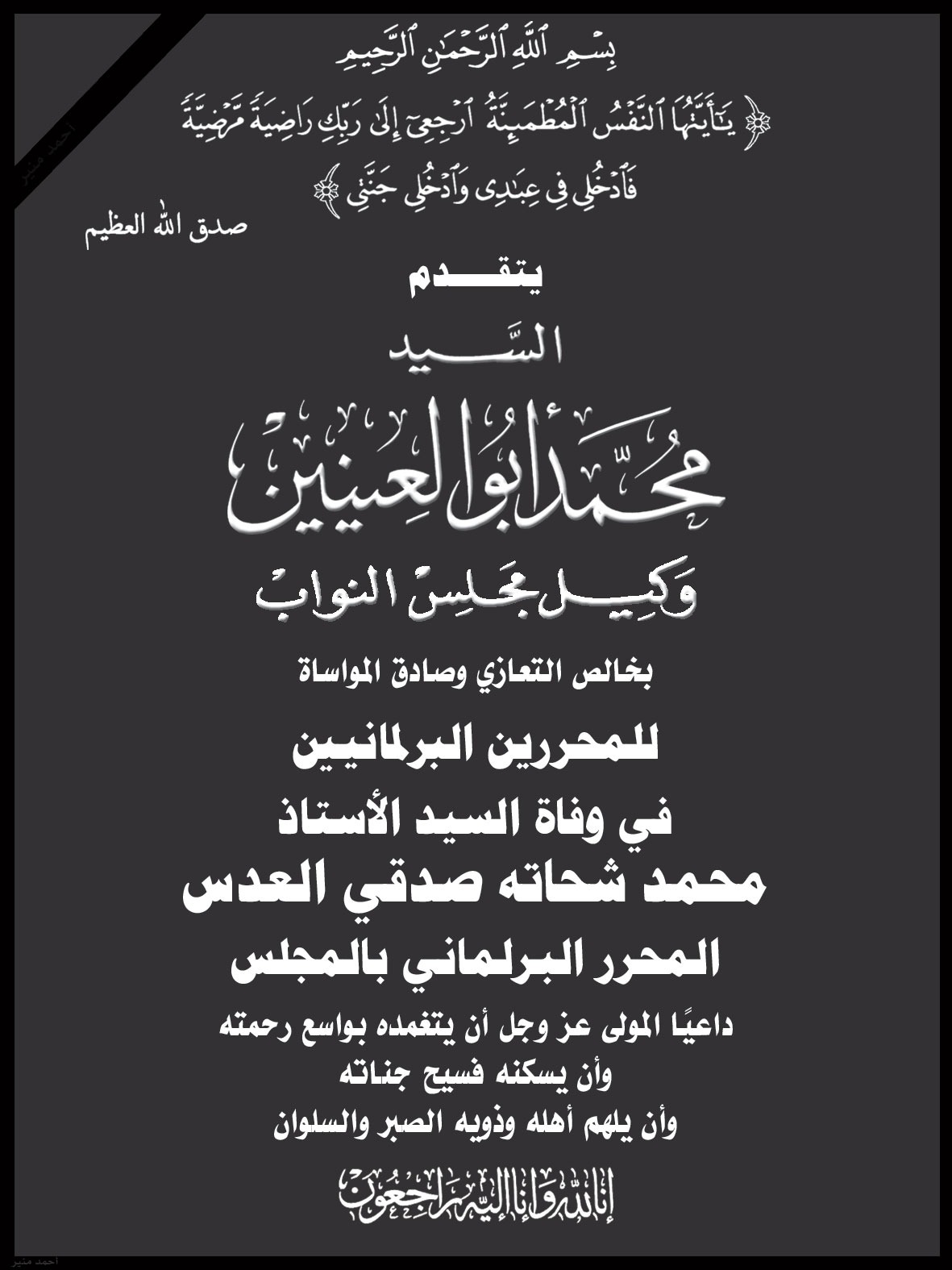 قدم النائب محمد أبو العينين وكيل مجلس النواب، خالص التعازي وصادق المواساة للمحررين البرلمانيين في وفاة محمد العدس المحرر البرلماني بالمجلس، داعيا المولى عز وجل أن يتغمده بواسع رحمته وأن يسكنه فسيح جناته، وأن يلهم أهله وذويه الصبر والسلوان.