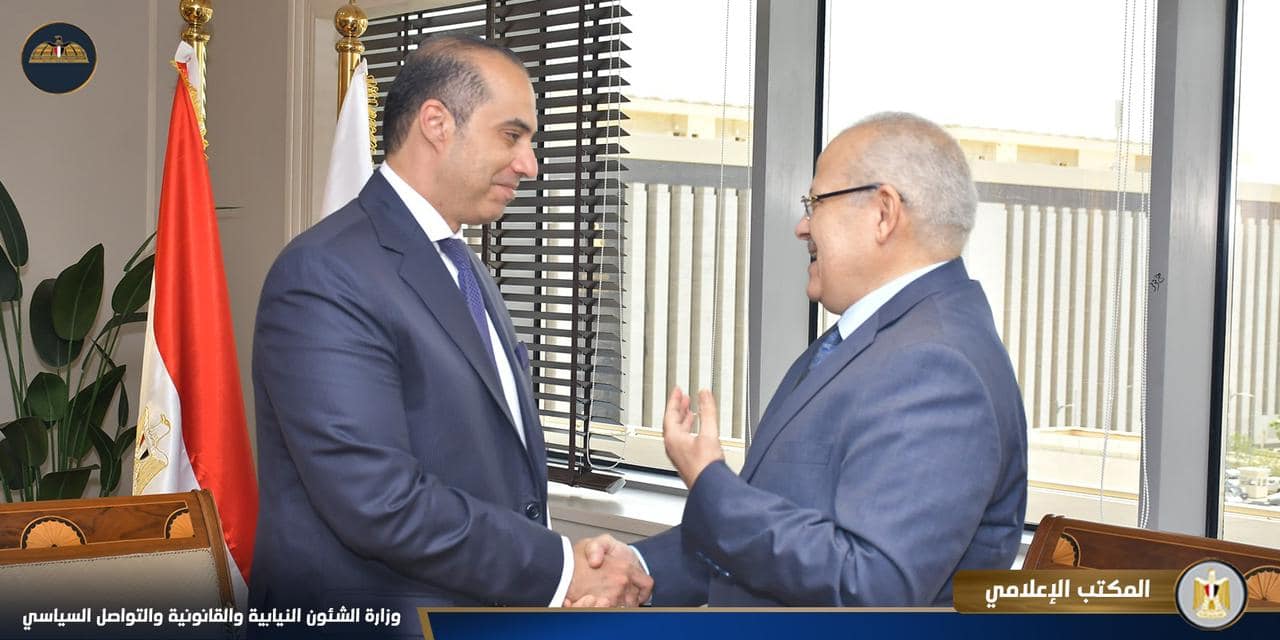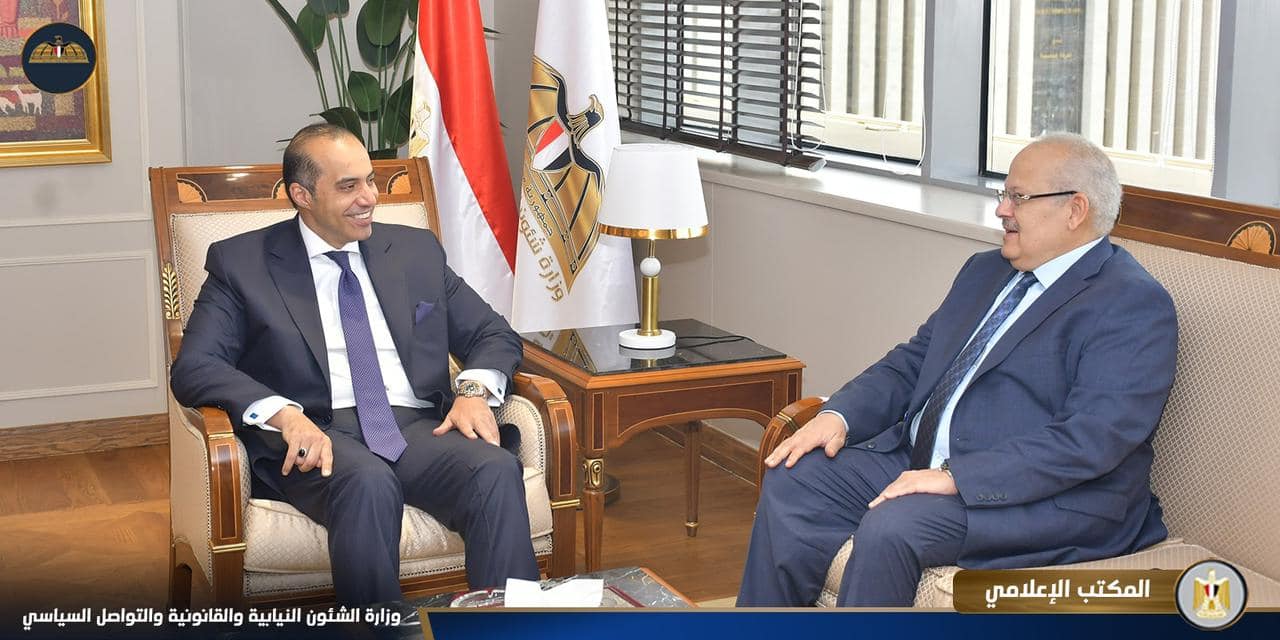 المستشار محمود فوزي وزير الشئون النيابية والقانونية والتواصل السياسي يستقبل رئيس جامعة القاهرة