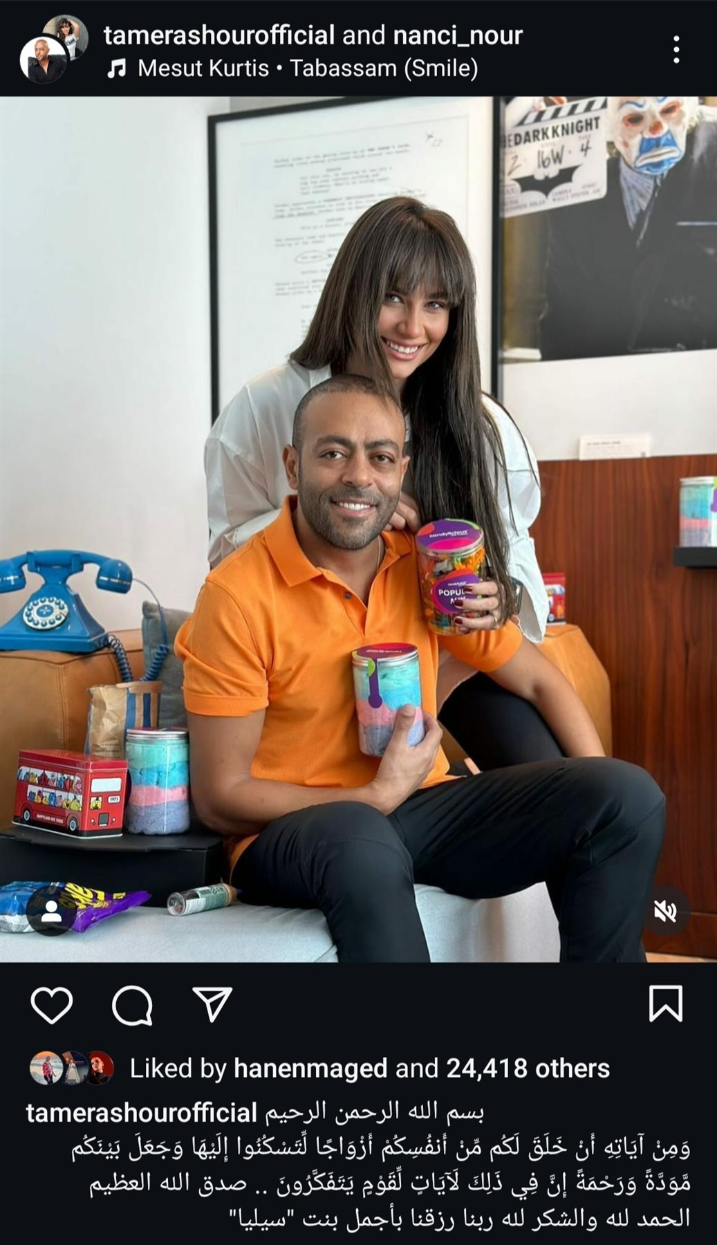 ونشر تامر عاشور صورة له رفقة زوجته نانسي نور في منشوره الذي يرصده موقع تحيا مصر، وكتب عليه: "بسم الله الرحمن الرحيم وَمِنْ آيَاتِهِ أَنْ خَلَقَ لَكُم مِّنْ أَنفُسِكُمْ أَزْوَاجًا لِّتَسْكُنُوا إِلَيْهَا وَجَعَلَ بَيْنَكُم مَّوَدَّةً وَرَحْمَةً إِنَّ فِي ذَلِكَ لَآيَاتٍ لِّقَوْمٍ يَتَفَكَّرُونَ.. صدق الله العظيم، الحمد لله والشكر لله ربنا رزقنا بأجمل بنت سيليا"، وقد حاز المنشور على إعجاب عدد كبير من الجمهور والمتابعين الذين هنئوه بميلاد ابنته.