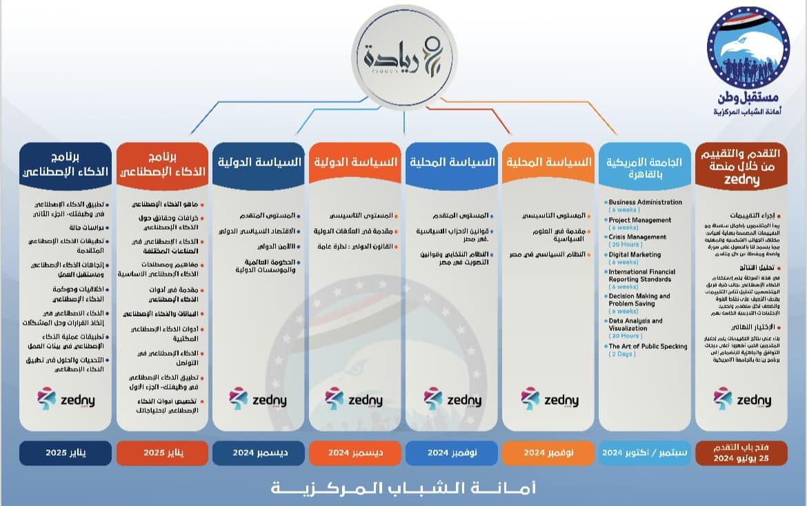 كشف حزب مستقبل وطن عن تفاصيل الالتحاق ببرنامج ريادة لإعداد وتأهيل الشباب لممارسة العمل السياسي من خلال مجموعة متنوعة من التدريبات والدورات على مدار ثلاثة أشهر على النحو التالي: