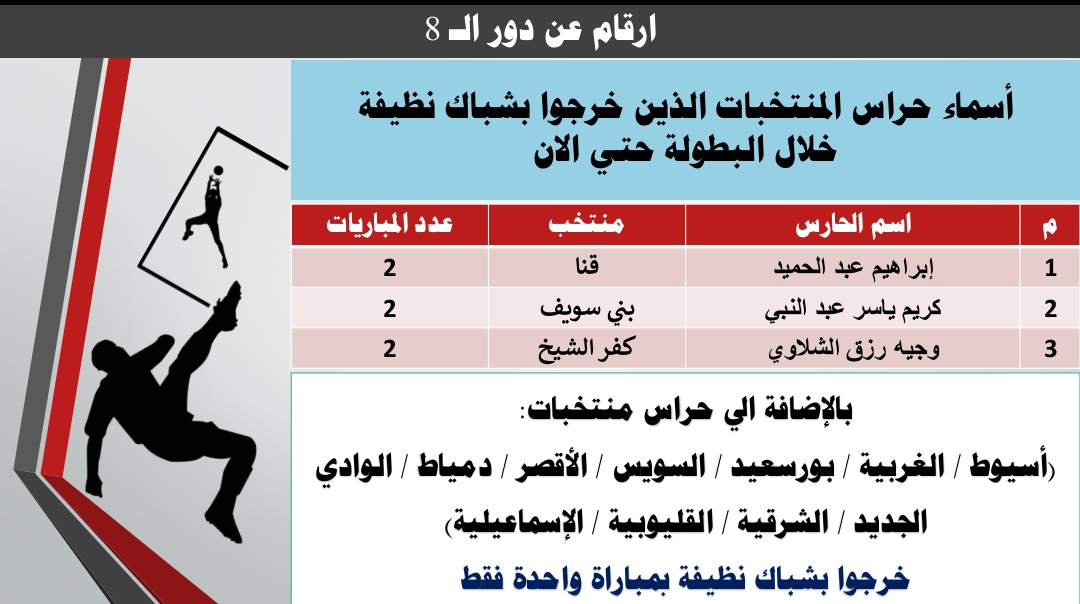 وخرج بالشباك نظيفة خلال النهائيات في مباراتين، حراس منتخبات قنا (إبراهيم عبد الحميد)، حارس منتخب بني سويف (كريم ياسر عبد النبي)، وحارس كفر الشيخ (وجيه رزق الشلاوي) .